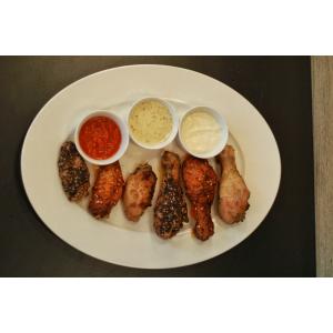 AILES DE POULET GRILLEES AUX ÉPICES D'ORIENT ET GRAINES DE SESAME TORREFIEES-GRILLED CHICKEN WINGS MARINATED IN ORIENTAL SPICES OR PROVENCAL HERBS WITH ROASTED SESAME SEEDS